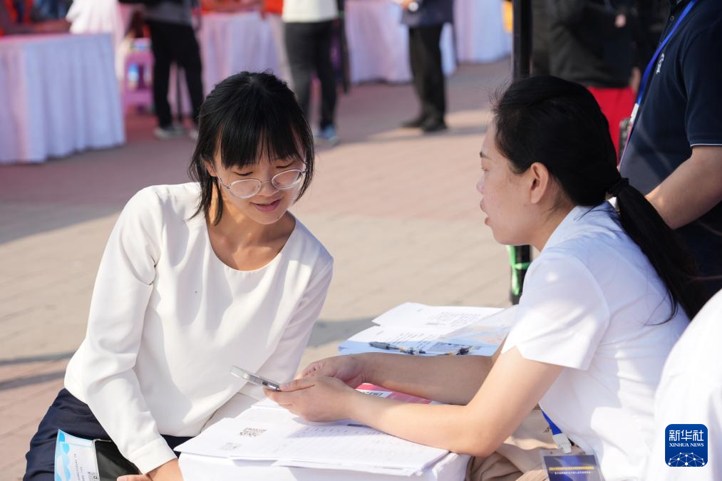 9月25日,求职者(左)在招聘会现场与招聘单位工作人员交流。