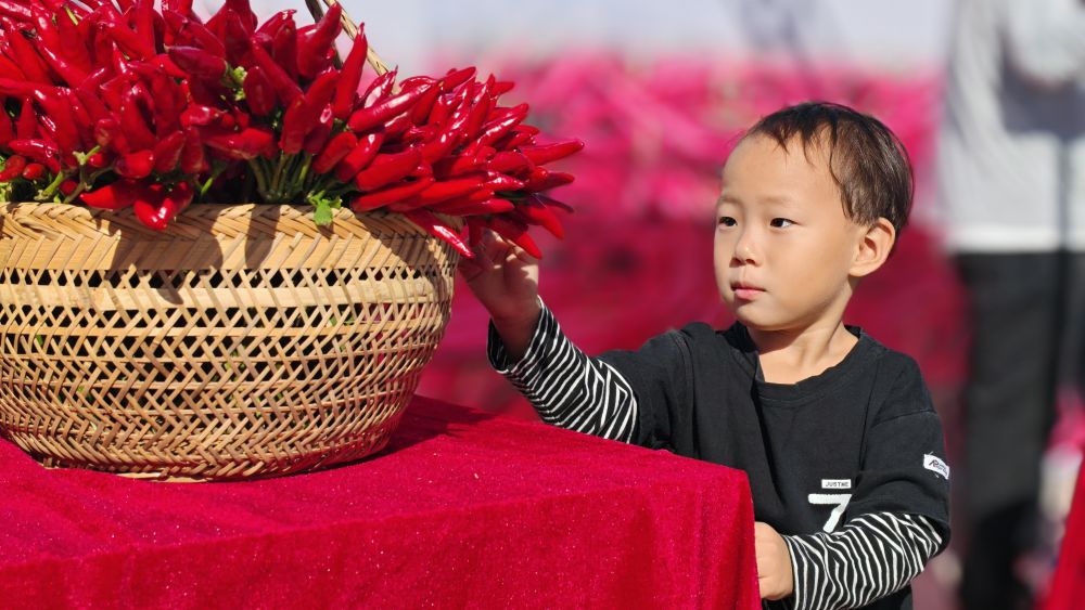 ↑9月22日,在第十八届全国辣椒产业大会上,小朋友在观赏辣椒。(栗志安 摄)