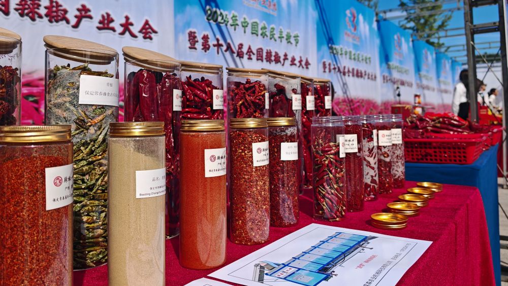↑这是9月22日拍摄的第十八届全国辣椒产业大会上展出的特色食品。(栗志安 摄)