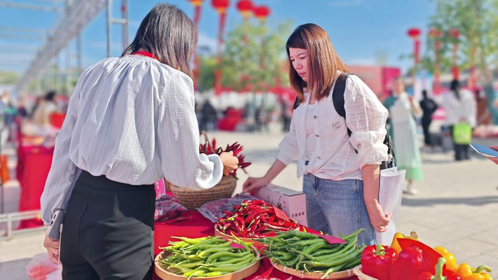 ↑9月22日,在第十八届全国辣椒产业大会上,游客在特色食品展区挑选产品。(栗志安 摄)