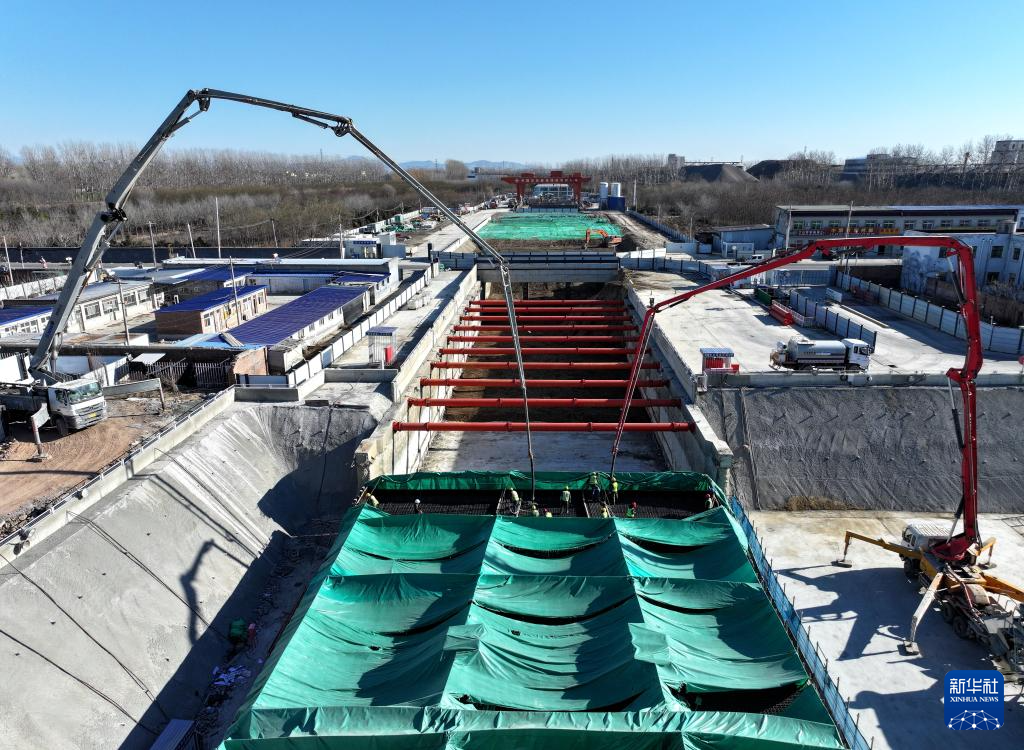 12月9日,工人在北京轨道交通22号线(平谷线)河北段高楼站建设现场施工。