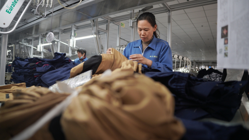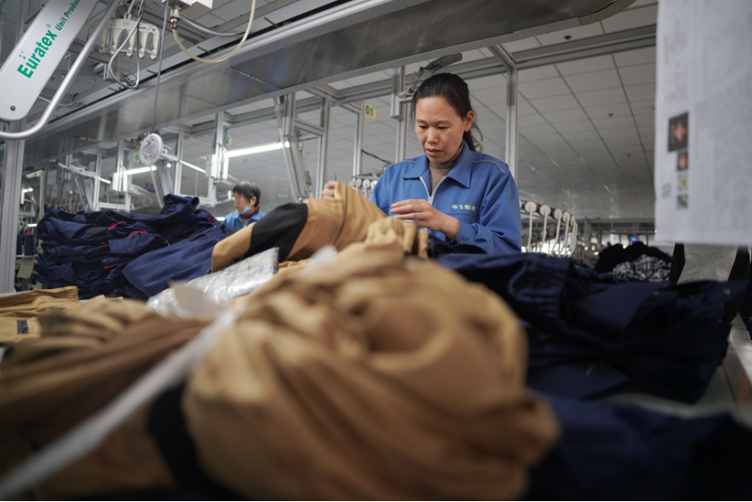 工人在车间加工服装。刘继东 摄