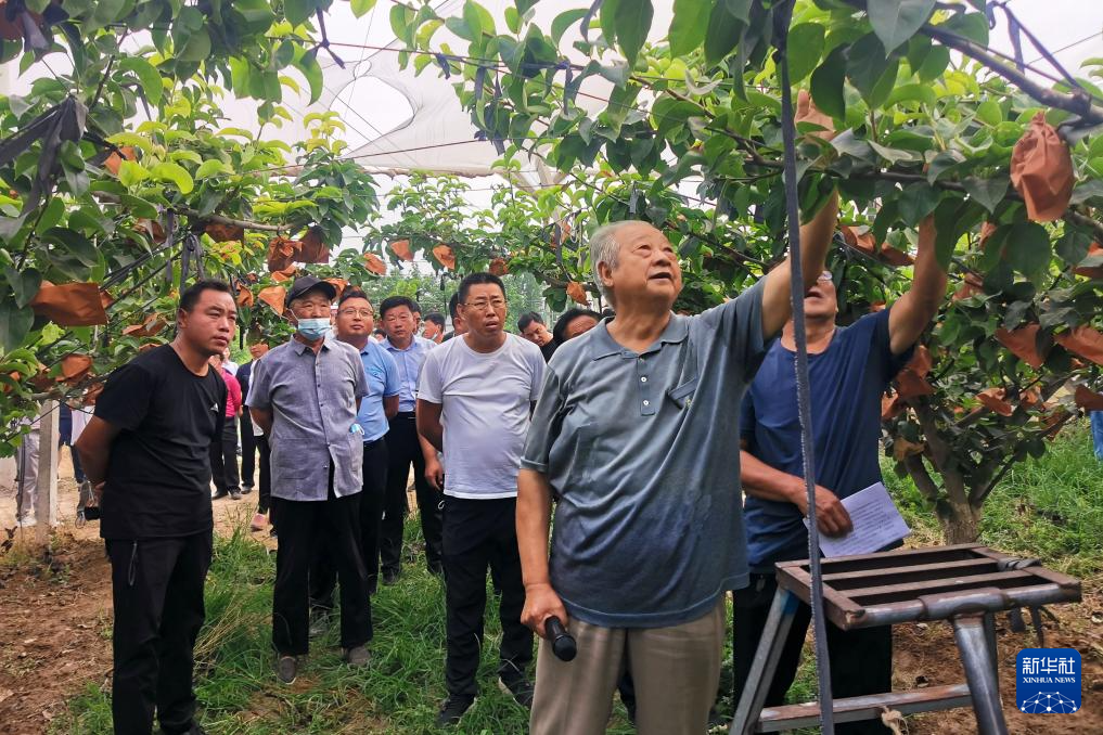 2021年6月29日,曲宪忠为梨农讲解梨果剪枝知识。(受访单位供图)