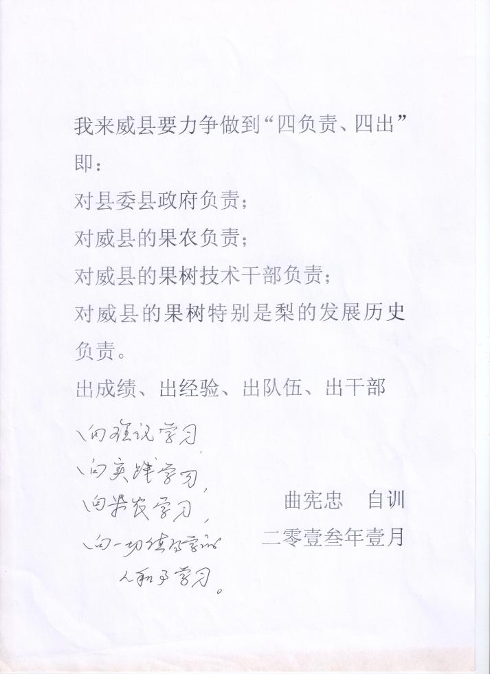 工作人员在整理曲宪忠的遗物时,发现了一则“自训”:“我来威县要力争做到‘四负责、四出’:对县委县政府负责;对威县的果农负责;对威县的果树技术干部负责;对威县的果树特别是梨的发展历史负责。出成绩、出经验、出队伍、出干部。”