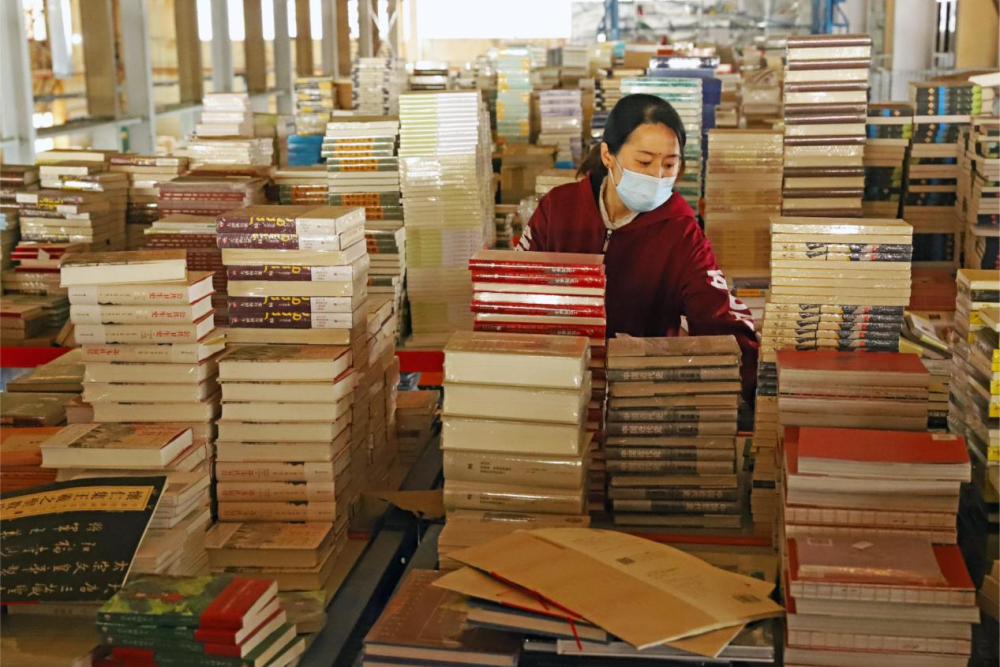 ↑2月24日,在涿州市中图网仓储中心,工人在整理图书。