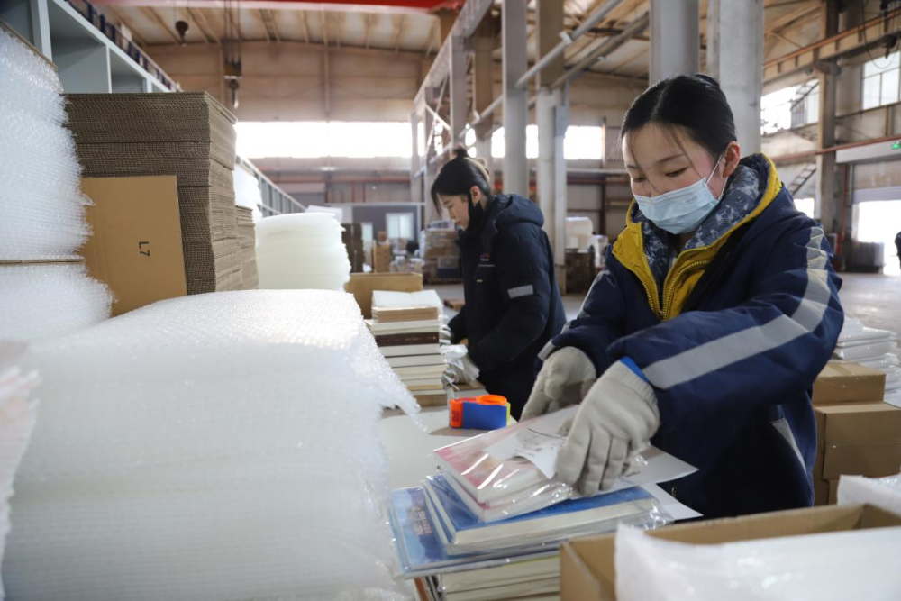 ↑2月24日,在涿州市中图网仓储中心,工人在打包图书。