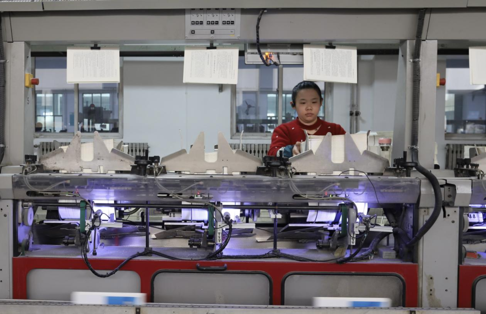 ↑2月24日,在涿州市星河印刷厂,工人在装订图书。