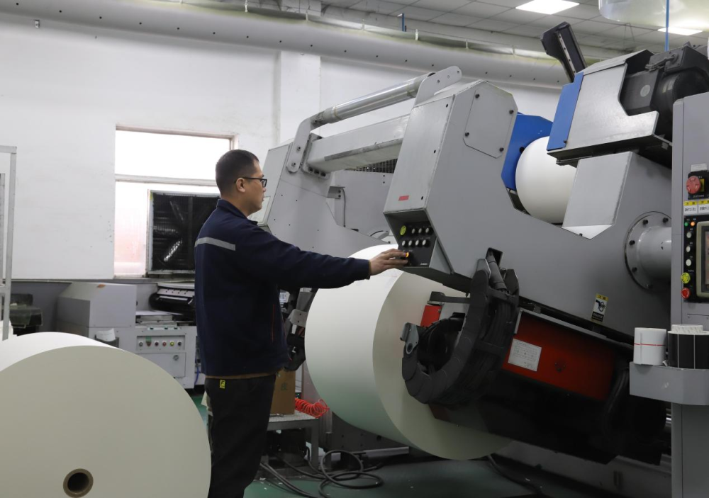 ↑2月24日,在涿州市星河印刷厂,工人在操作送纸机。