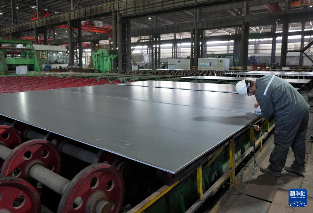 3月24日,工人在唐山市海港经济开发区一家钢铁企业宽厚钢板生产线上工作。