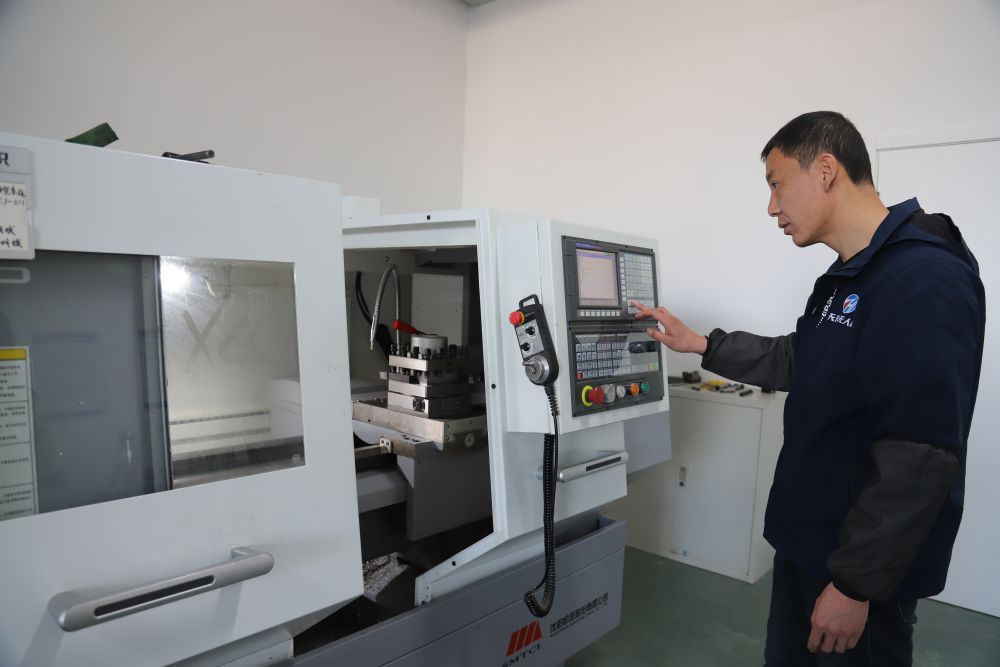 ↑3月24日,在河北天海无人驾驶航空器有限公司生产车间内,工人在操作数控机床。