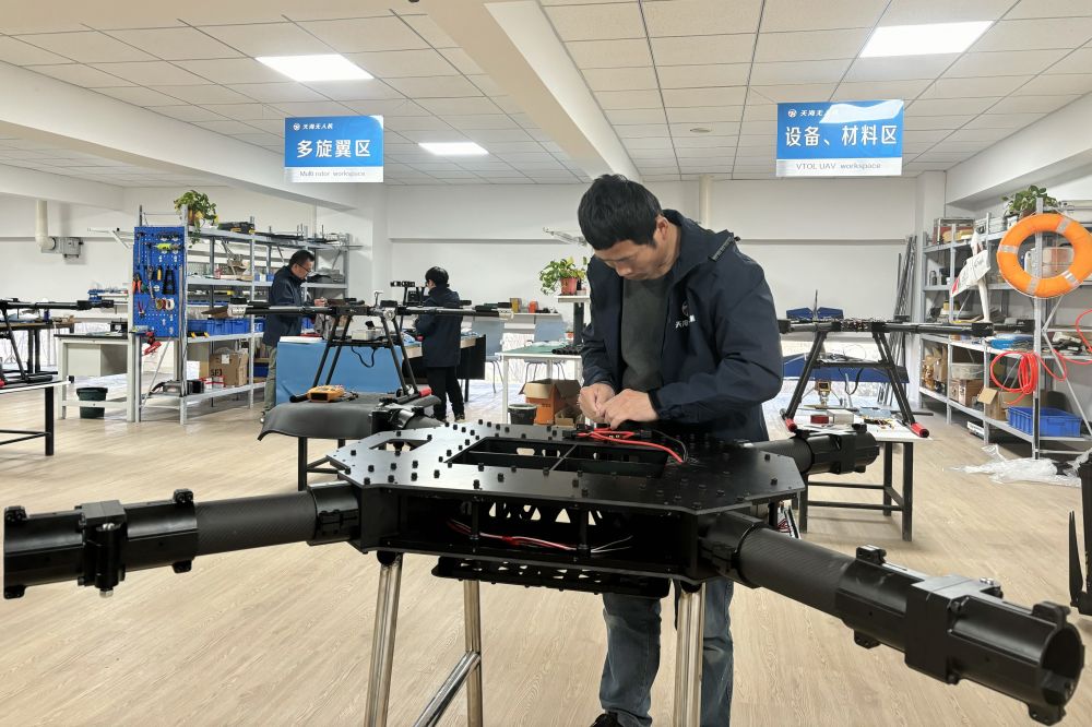 ↑3月24日,在河北天海无人驾驶航空器有限公司组装车间内,工人在组装无人机。