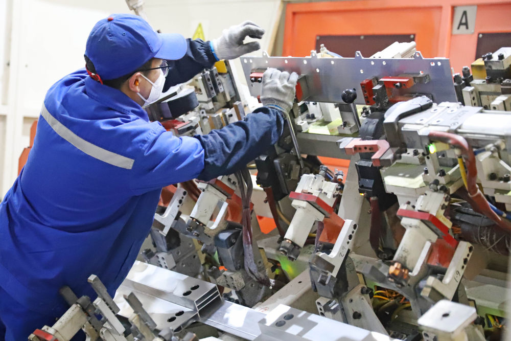 ↑3月24日,在北方凌云工业集团有限公司生产线上,工人为智能设备加装材料。