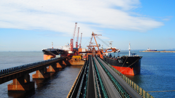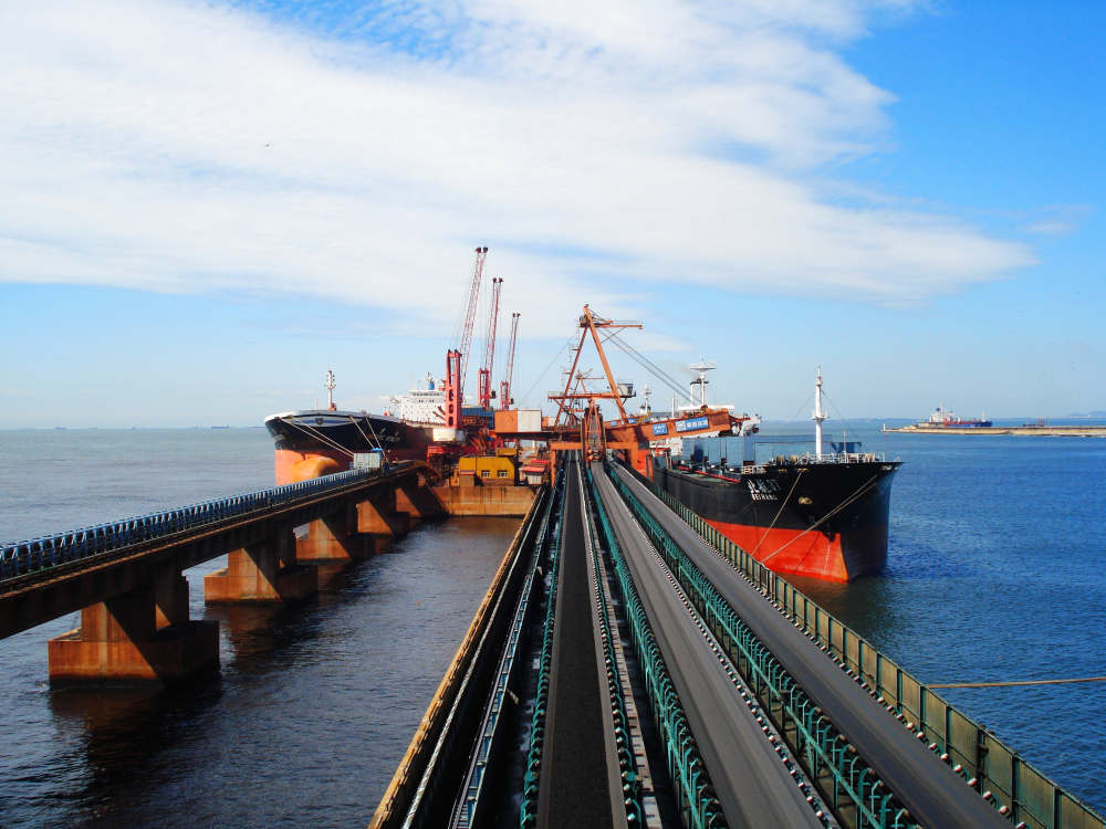 ↑5月15日,在秦皇岛港的货轮在装载电煤。(闫洪峰 摄)