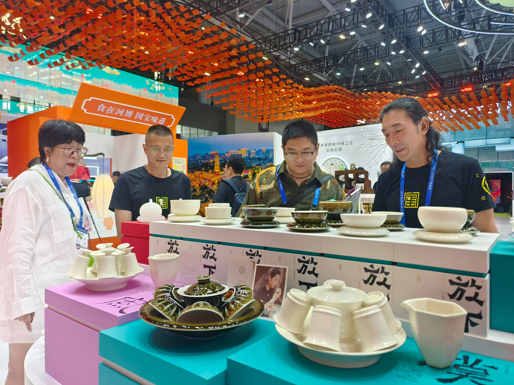 ↑5月22日,在第二十一届文博会上,参展人员在参观曲阳定瓷。