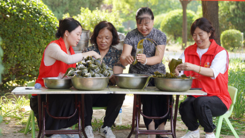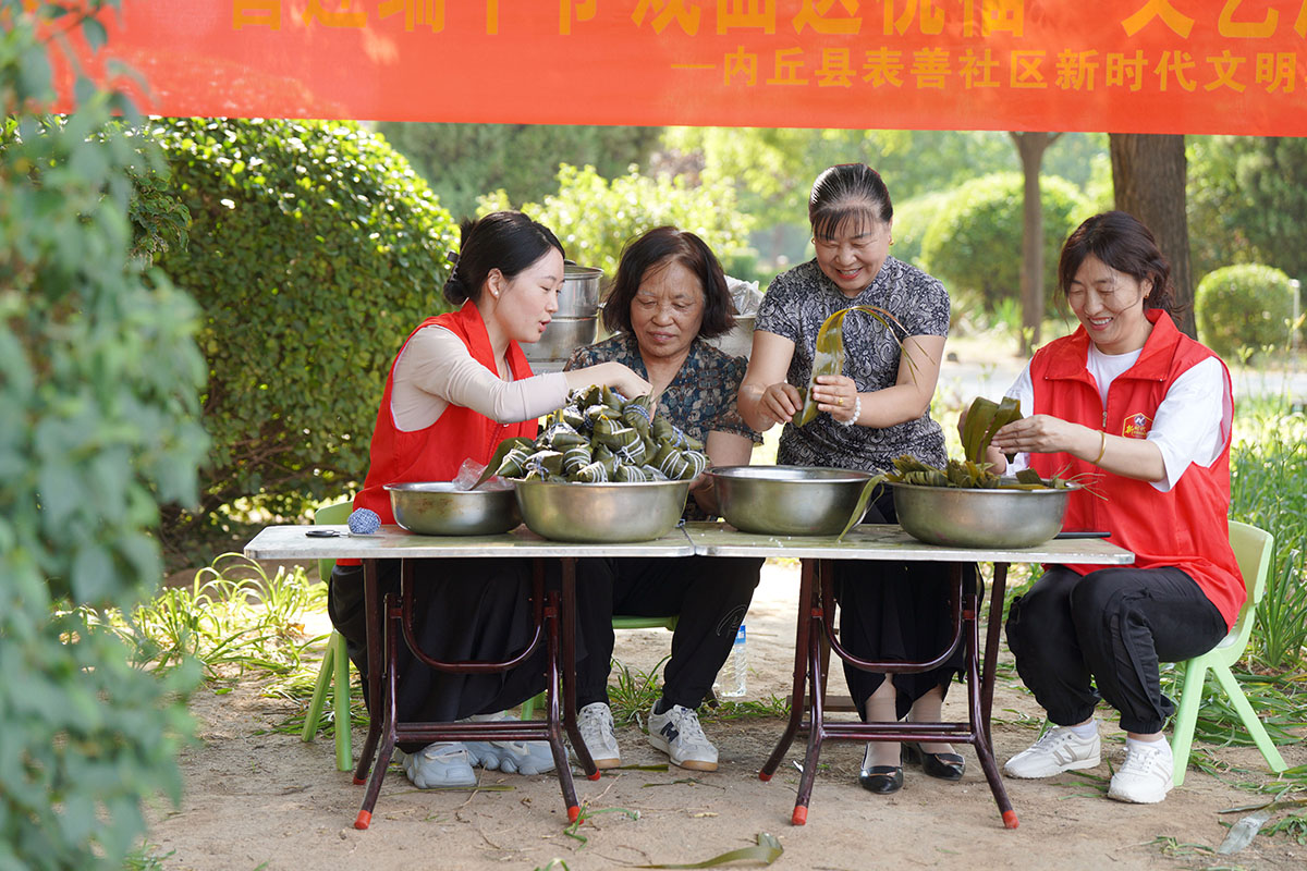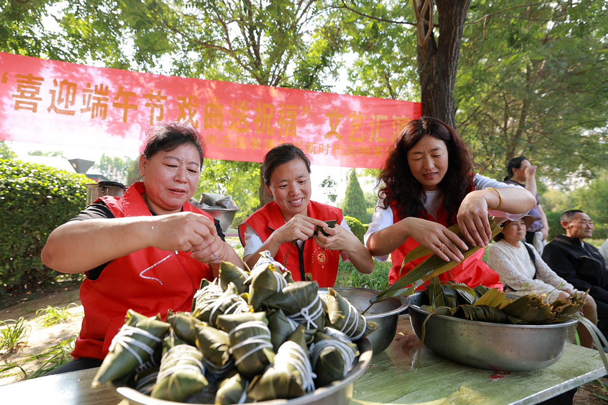 5月27日,河北省邢台市内丘县新时代文明实践中心举行“双争有我·我们的节日·端午”主题文化活动。当地社区居民一边包粽子,一边欣赏文艺节目,在欢快喜庆的氛围中迎接端午佳节的到来。(刘继东 内丘县融媒体中心供稿)
