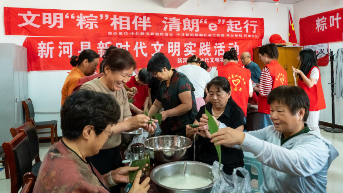 近日,河北新河县委网信办联合县委社会工作部、县文明办,组织志愿者在祥泰社区新时代文明实践站开展“文明‘粽’相伴 清朗‘e’起行”主题宣传活动。