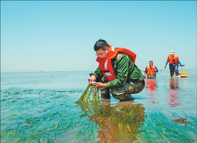 曹妃甸海草床修复项目技术人员在查看海草生长情况。赵杰 摄