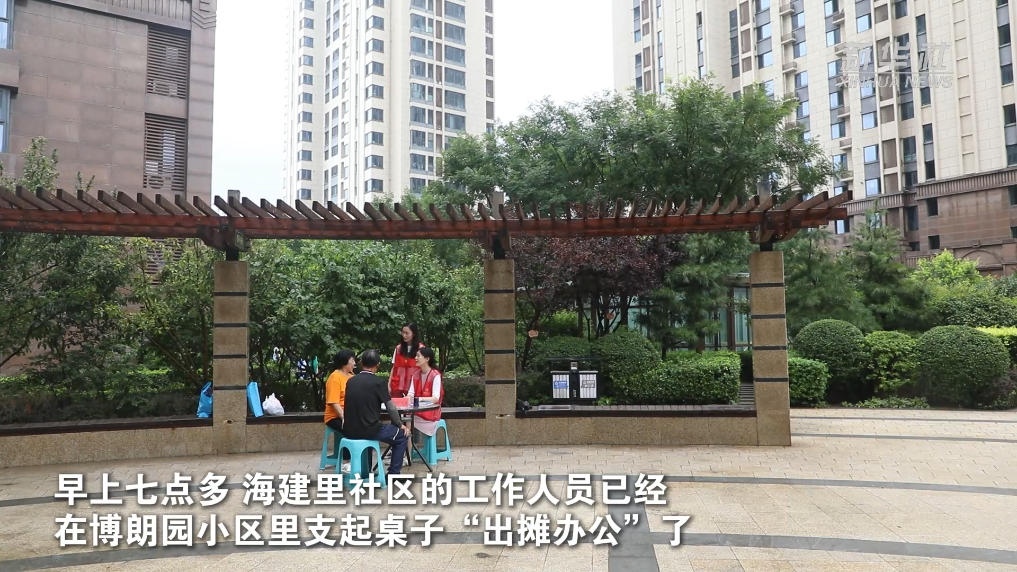 早上七点多,海建里社区的工作人员已经在博朗园小区里支起桌子“出摊办公”了。短短半日内,陆续有20多位居民前来咨询政策、办理业务,其中也不乏家长里短的倾诉。