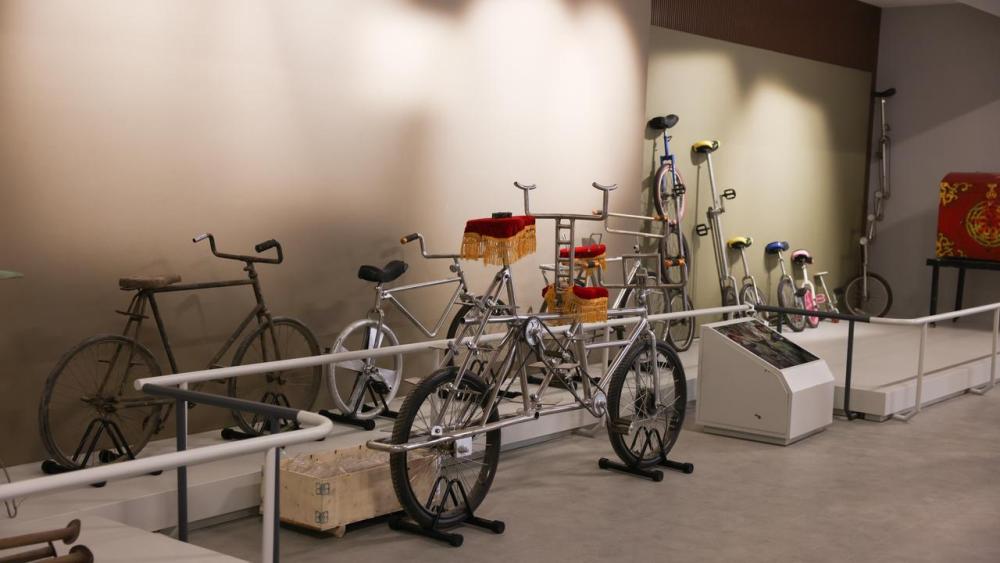 吴桥杂技博物馆内一角,摆放着自行车、独轮车等不同年代的杂技道具。受访者供图