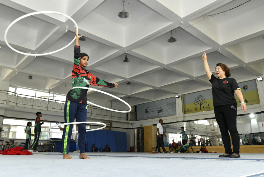 8月20日,来自孟加拉国的学员在河北吴桥杂技艺术学校排练厅内练习杂技。新华每日电讯记者牟宇 摄