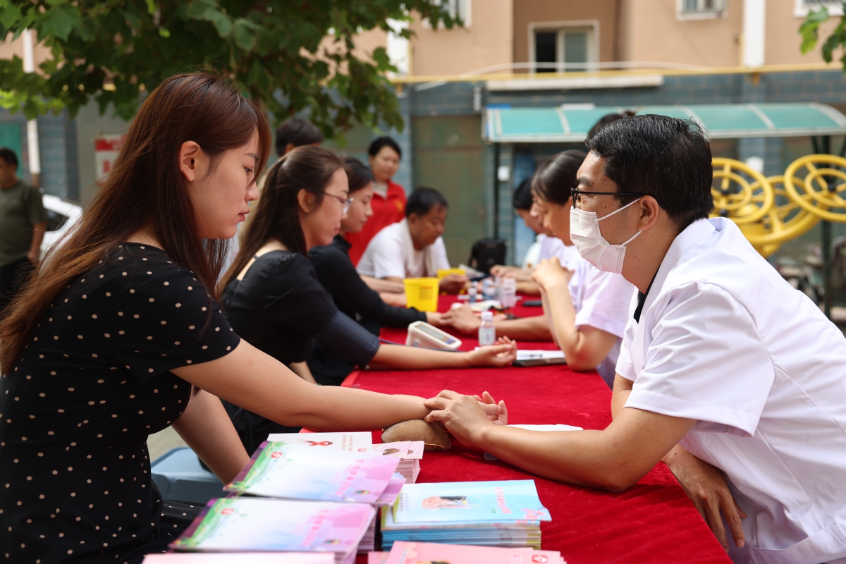医务人员向居民发放健康知识宣传册。李世强 摄