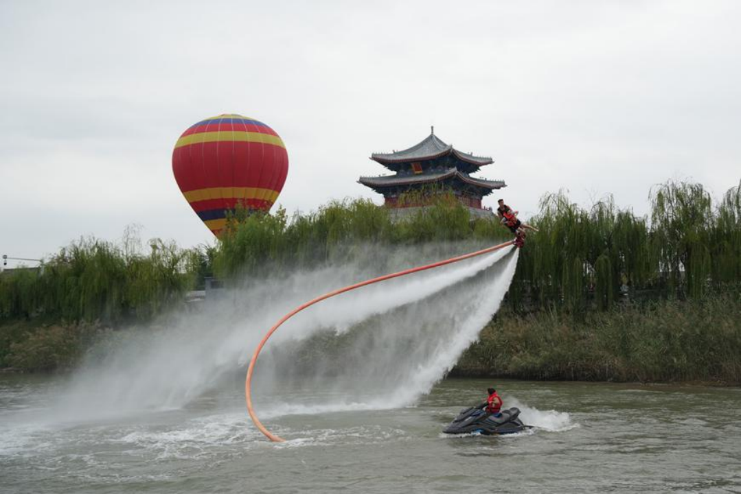 当天下午,各巡游方阵有序登场,亮点纷呈。陆路巡游方阵在沧州市狮城公园举行出发仪式,马队气势浩荡、列阵入场,活力四射的街舞演员与现场观众热情互动,瞬间点燃现场氛围。水路巡游沿着运河有序推进,摩托艇编队在水面飞驰炫技,“水上飞人”腾空翻转、完成一系列高难度动作,吸引不少观众参与体验。