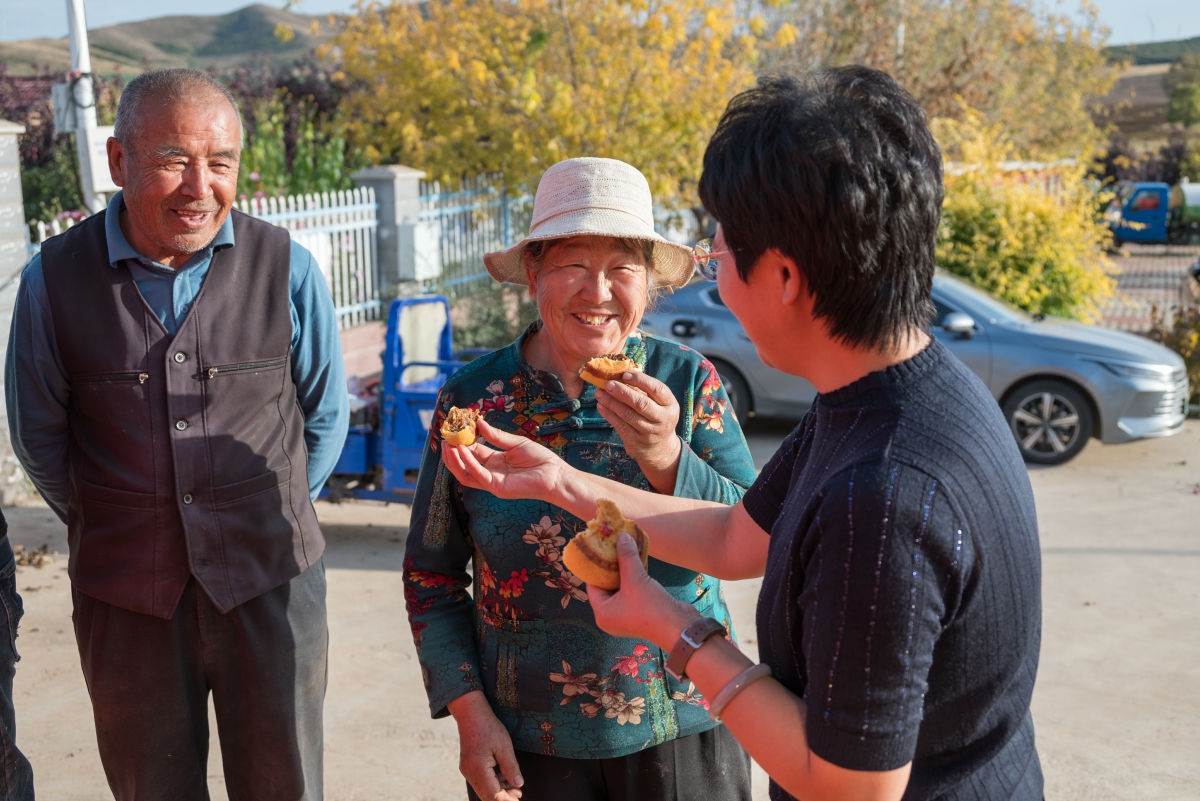 10月1日国庆节当天,在大石砬村委会,村民们依次从工作队和村干部手中接过象征“平安”的苹果和寓意“团圆”的月饼,院内洋溢着节日的欢乐氛围。