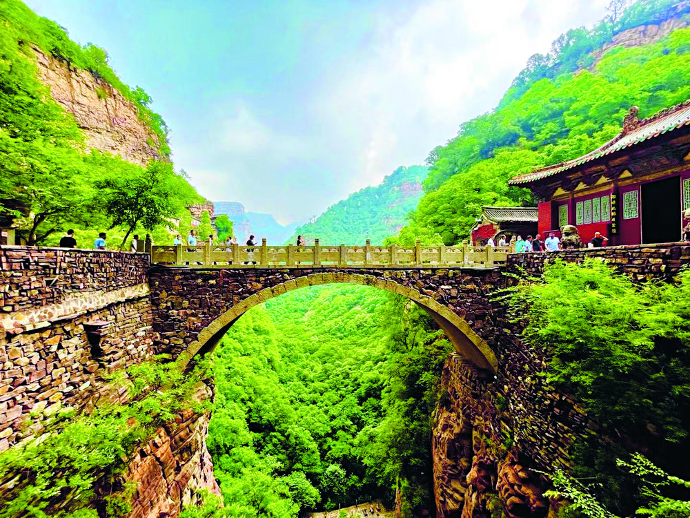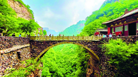 如果说嶂石岩展现了太行的雄奇,那井陉苍岩山则生动诠释了自然与人文的完美融合。山间的福庆寺内,一座单孔石桥凌空横跨峭壁,桥上殿宇飞檐翘角、悬于半空,形成“桥楼殿”经典景观。站在山脚下仰望,云雾缭绕间,古建仿佛漂浮于仙境。