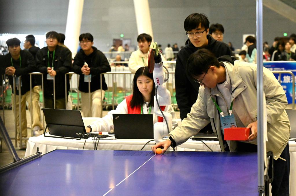 10月17日,乒乓球机器人在河北省石家庄国际会展中心进行比赛。