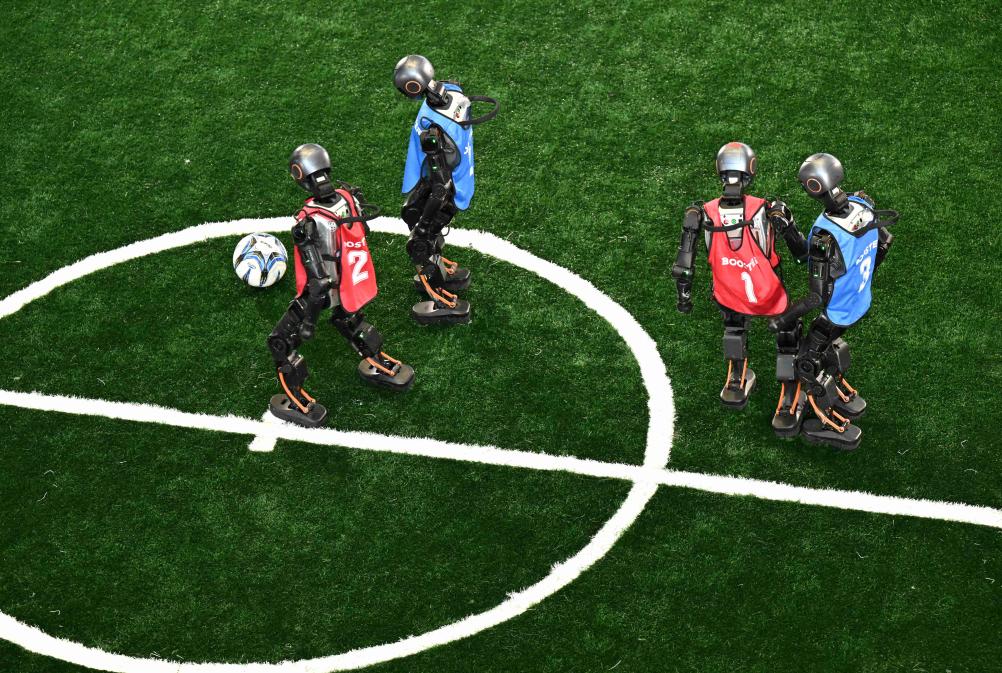 10月17日,机器人在河北省石家庄国际会展中心进行足球比赛。