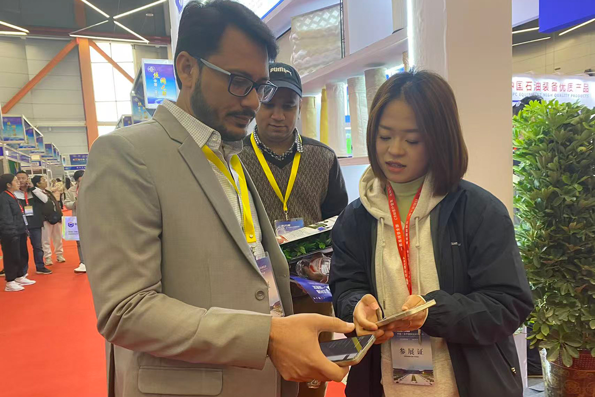 参展商与外国客商进行商贸洽谈。王子强 摄