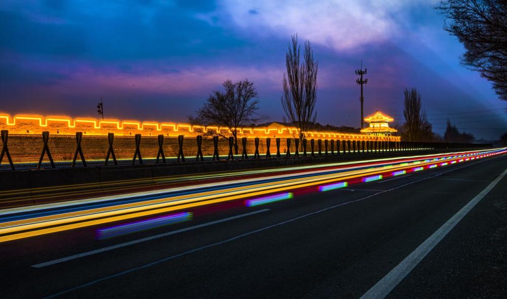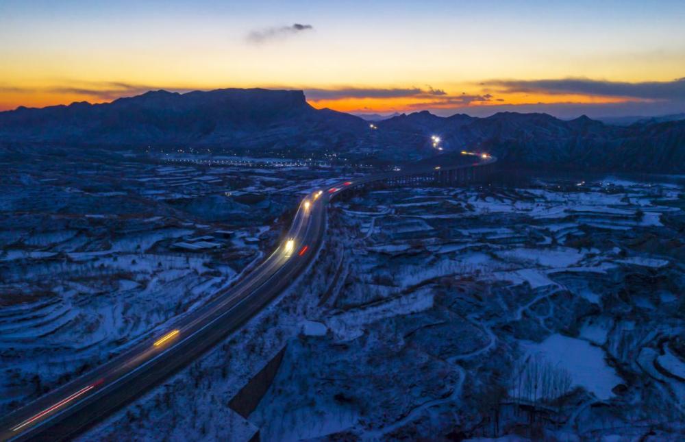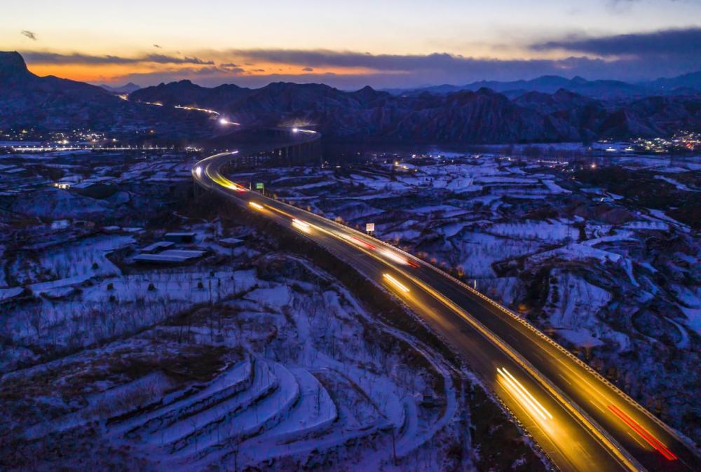 ↑延时法拍摄下的河北省张家口市境内的京藏高速。(2022年2月10日 柳新芳 摄)