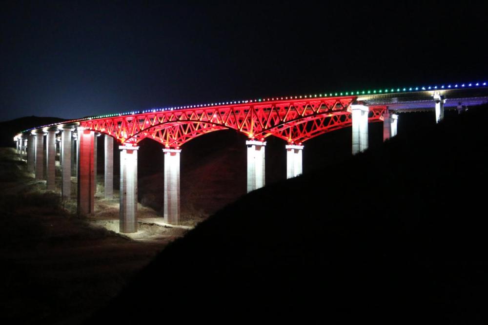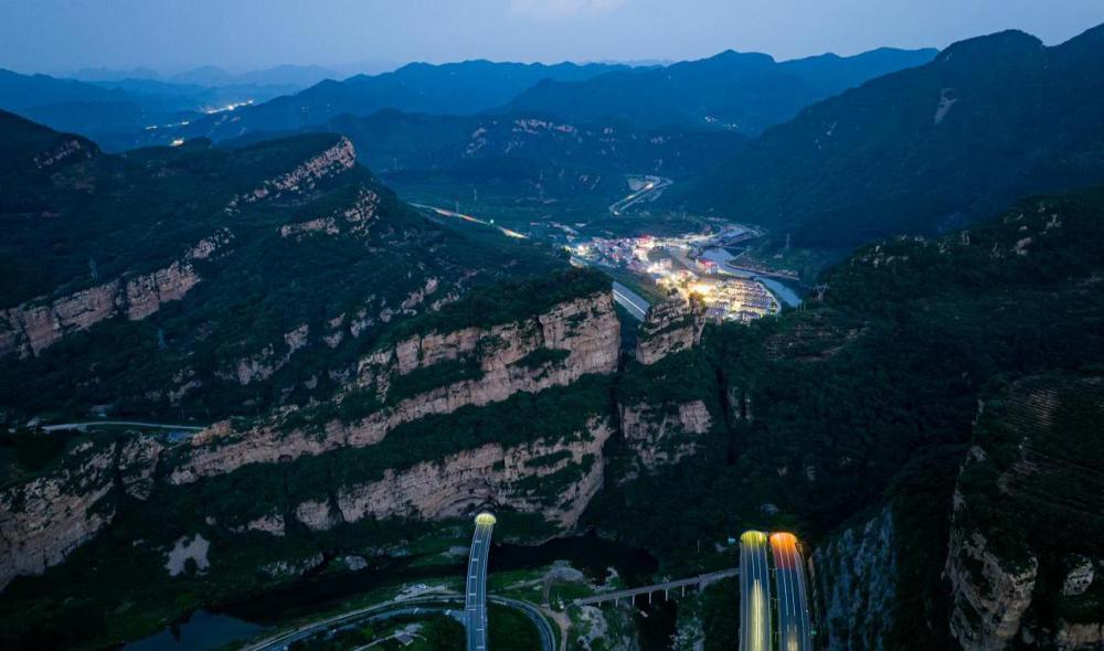 ↑延时法拍摄下的沧榆高速保定市曲阳县通天河大桥。(2023年12月20日 商仕佳 摄)