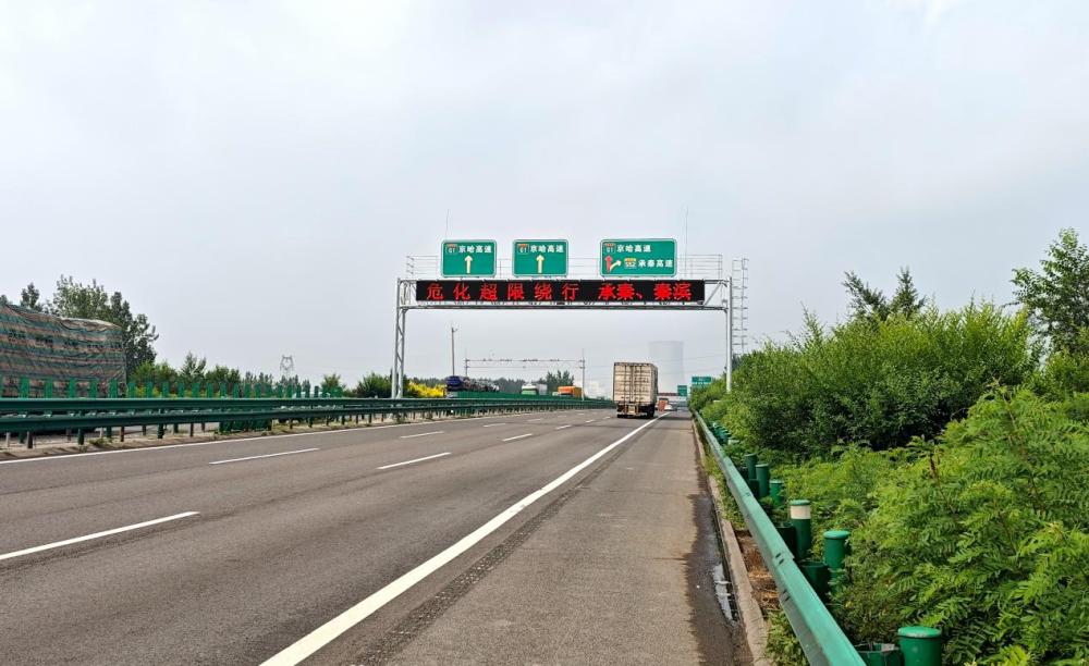 ↑京哈高速秦皇岛段的智能分流LED显示屏。(2025年7月3日 邹勇 摄)