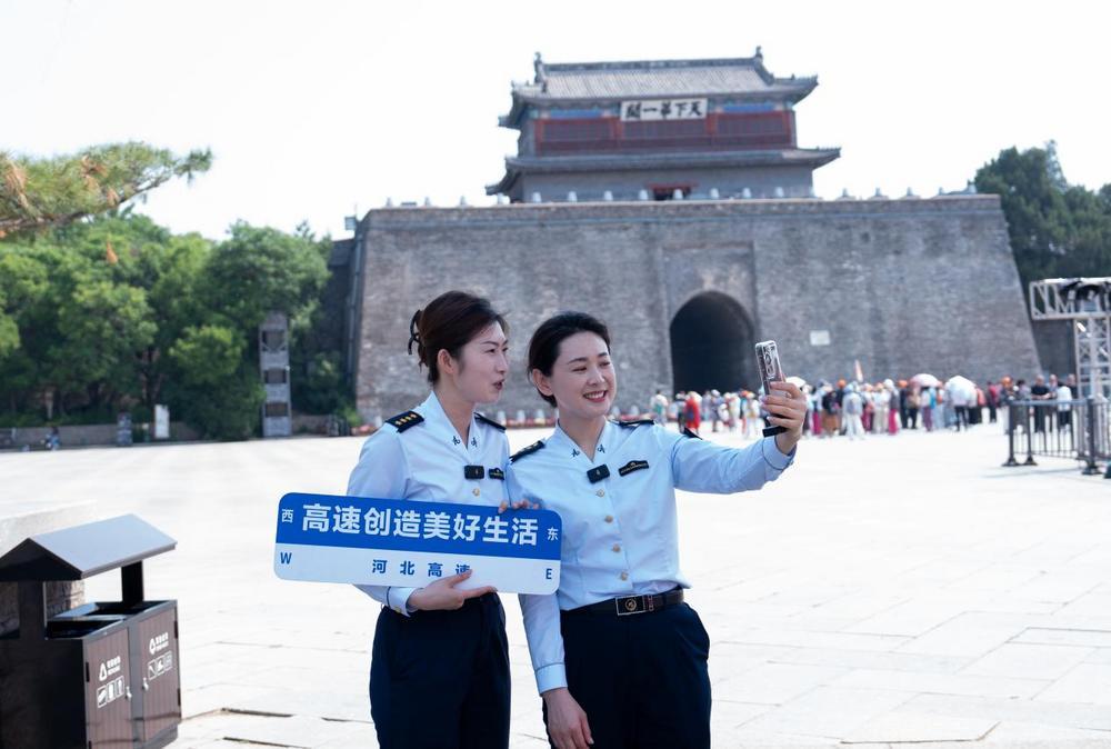 ↑河北高速集团京秦分公司工作人员在山海关景区开展直播活动。(2025年 7月17日 李贺 摄 )