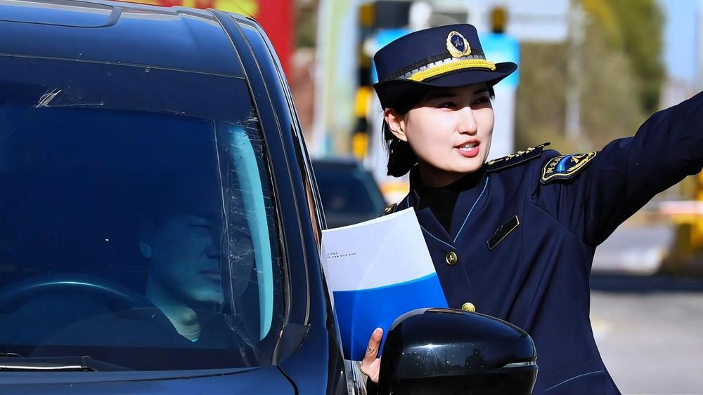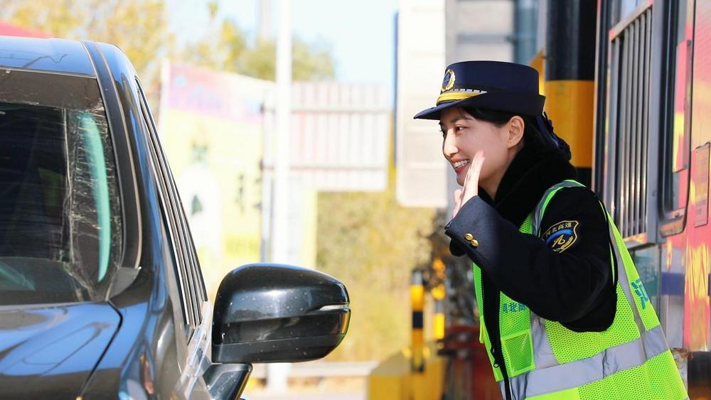 ↑在大广高速衡水收费站,工作人员为司乘指路。(2025年6月6日 毛皓 摄)