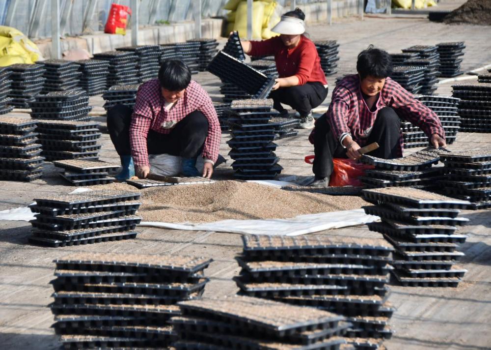↑11月19日,在邯郸市永年区张西堡镇借马庄村秋景育苗基地,农民在为穴盘填充育苗基质。