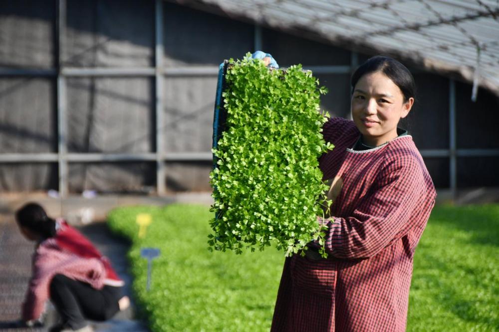 ↑11月19日,在邯郸市永年区秋景育苗基地,农民在展示蔬菜秧苗。