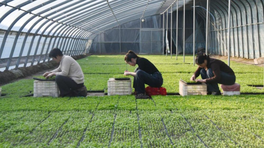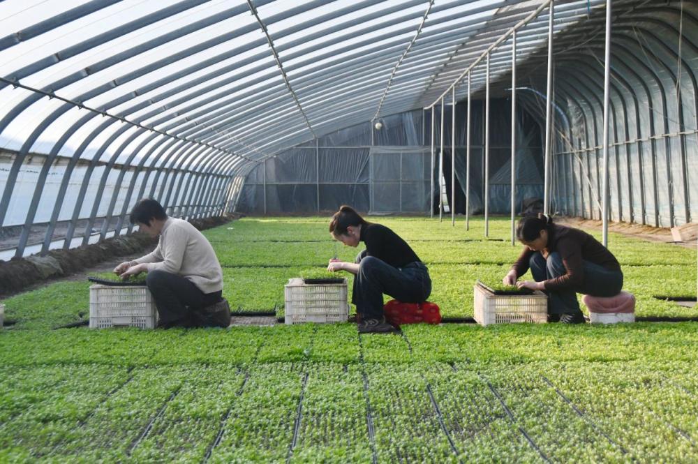 ↑11月19日,在邯郸市永年区广府镇裴屯村自强育苗基地,农民在管护蔬菜秧苗。