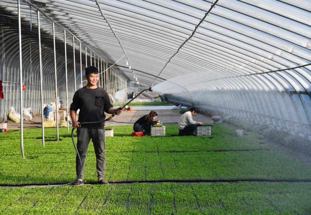 ↑11月19日,在邯郸市永年区广府镇裴屯村自强育苗基地,农民在为蔬菜秧苗浇水。