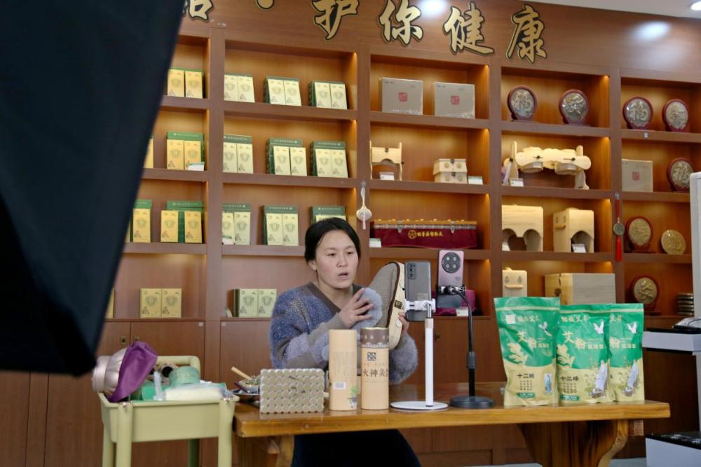 ↑12月1日,在馆陶县一艾草企业,工作人员在直播销售艾草产品。