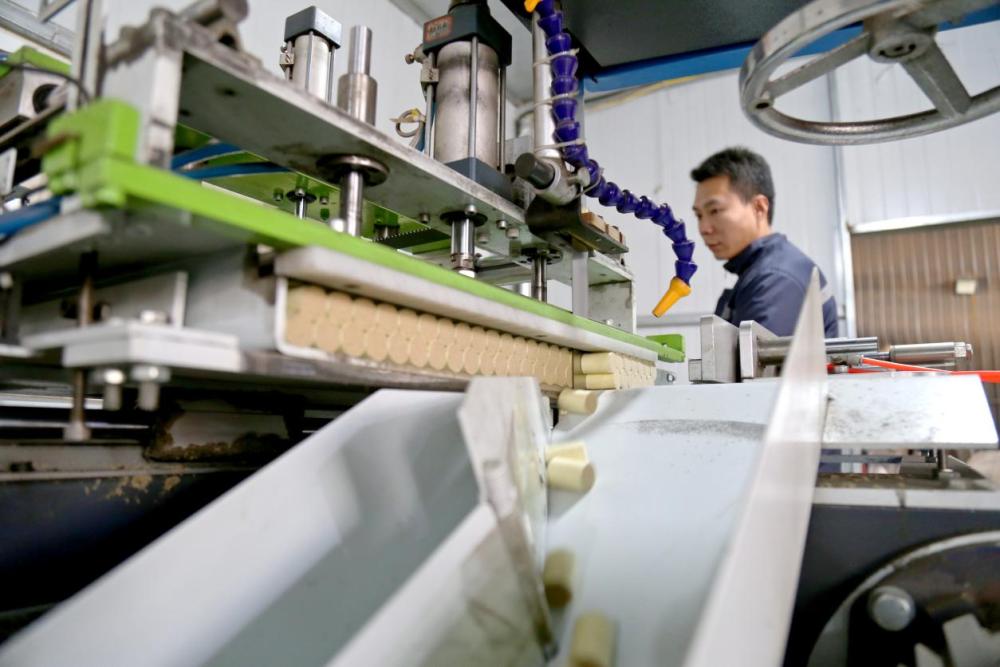 ↑12月1日,在馆陶县一艾草企业,工人在生产艾草产品。
