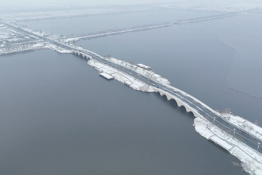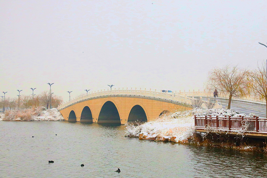 12月13日,河北邢台南宫市南宫湖公园雪后初晴。湖水与树木、楼宇相映成趣,勾勒出一幅静谧的冬日生态画卷。