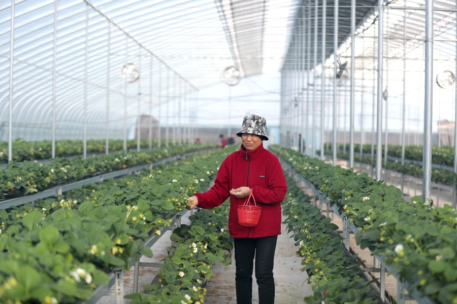 石家庄市井陉县小作村智能温室大棚里,村民在采摘草莓。