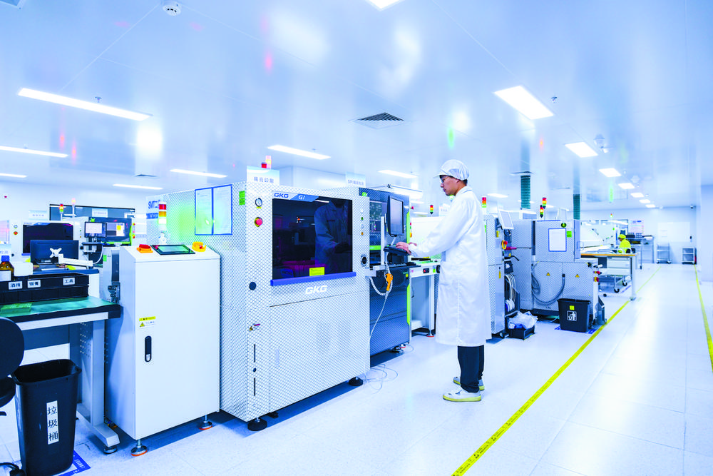 石家庄步沐电子有限公司将积淀多年的工艺、质量与生产管理体系转化为面向市场的开放式服务资源,已成为区域性高端电子装备共享智造平台。图为该公司生产车间内,工作人员进行电子产品生产。