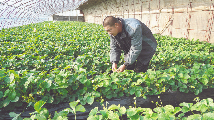 而嗅得市场商机的村“两委”主动作为,引导村民改良品种、扩大种植规模。从散户零散种植到集中流转土地,从简易竹棚到标准化温室大棚,围杆庄村草莓种植逐步走向规范化、规模化。如今,全村草莓种植面积达850亩,形成集中连片的种植基地,年产值超4000万元。