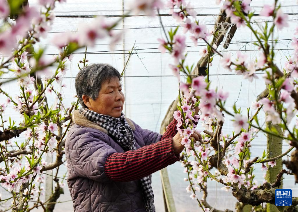 2月4日,河北省唐山海港经济开发区王滩镇的一位农民在大棚内给桃树疏花。