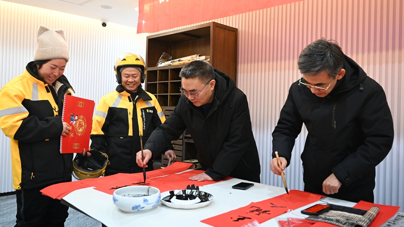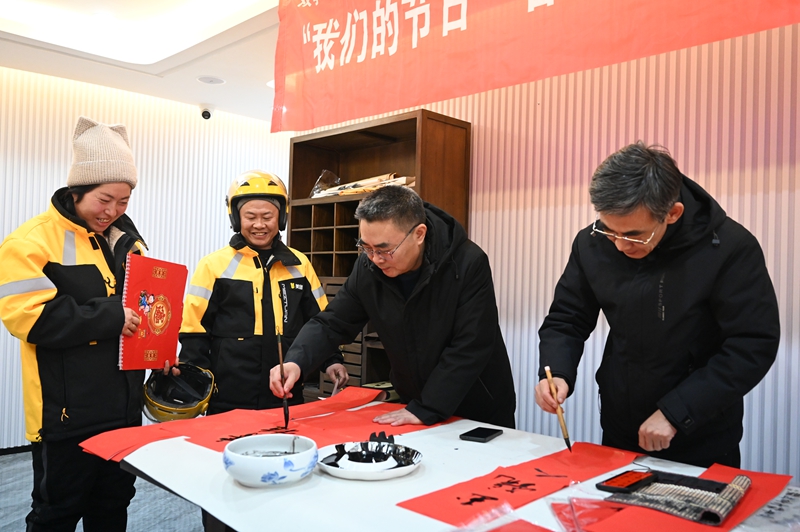 活动通过“温暖地图”集中展示暖“新”友好场景建设成果,详细介绍了驿站位置查询、爱心服务清单与24小时服务功能,现场同步开展交通安全宣讲与政策权益解读,并为从业者代表送上慰问礼品,传递暖心关怀。活动还特别邀请了3名书法家为大家现场写春联、送祝福。笔走龙蛇间,一副副寓意吉祥的春联、一个个喜气洋洋的“福”字跃然纸上,为活动增添了浓郁年味。