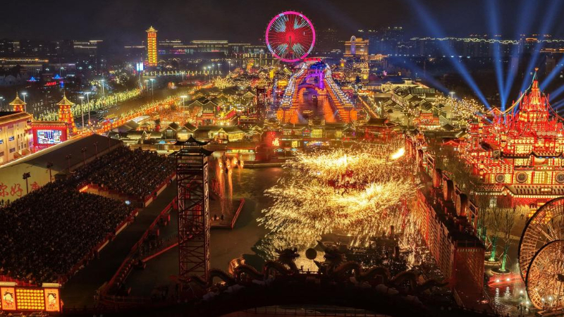 春节期间,河北省唐山市丰南区河头老街灯火璀璨、火树银花,为游客呈现出一场流光溢彩的视觉盛宴。