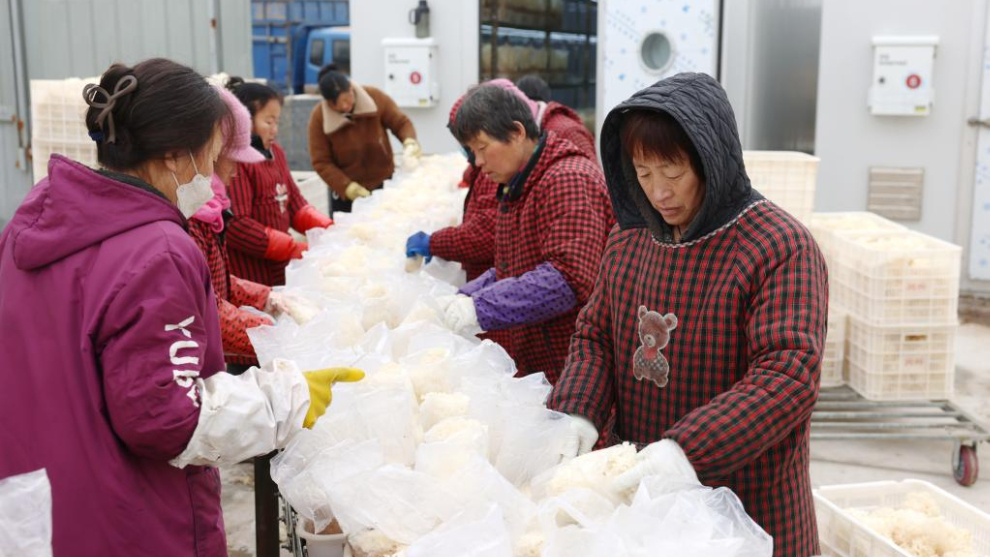 2月27日,河北省新河县众乐种植专业合作社工人在分拣包装绣球菌。